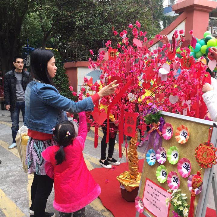 家長(zhǎng)帶著孩子把新一年的心愿掛在桃花樹(shù)上!
