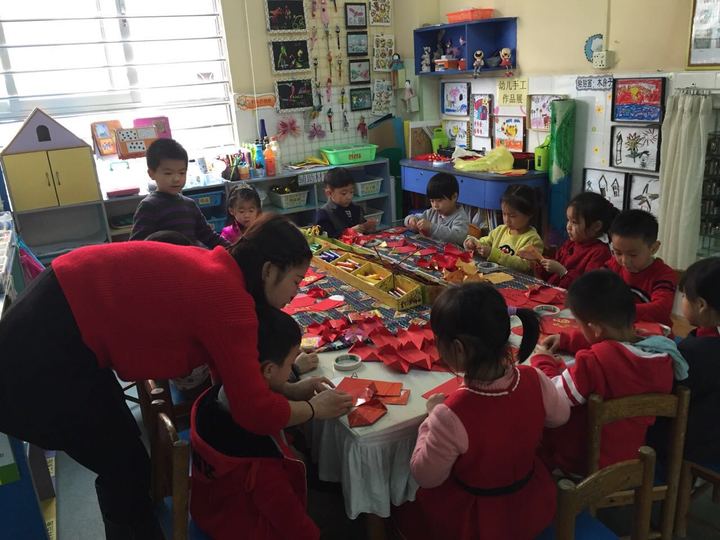 老師和孩子們一起做燈籠過(guò)元宵