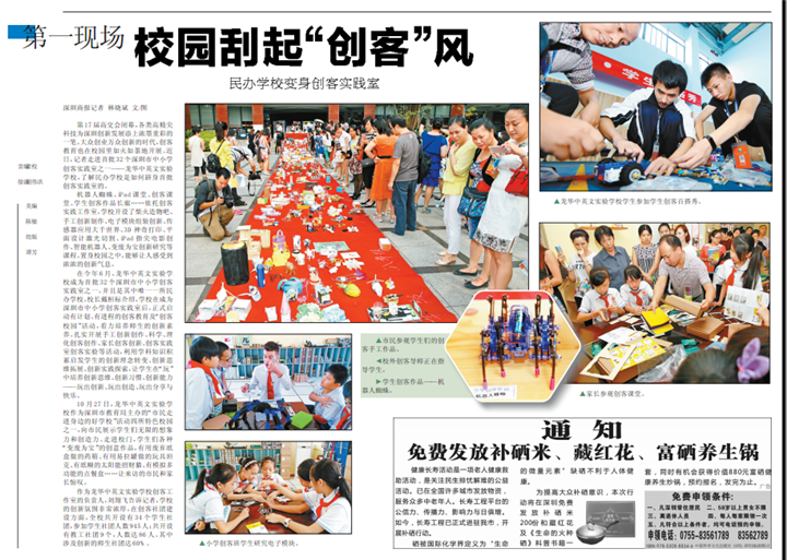10月27日,龍華中英文實(shí)驗(yàn)學(xué)校作為深圳市教育局主辦的“市民走進(jìn)身邊的好學(xué)校”活動四所特色校園之一,向市民展示學(xué)生們無限的想象力和創(chuàng)造力。走進(jìn)校門,學(xué)生們各種“變廢為寶”的創(chuàng)意作品,有用廢棄紙盒做的藥箱、有用易拉罐做的玩具坦克、有紙糊的太陽能招財(cái)貓、有模擬多功能的點(diǎn)餐盒……讓來訪的市民和家長驚嘆。