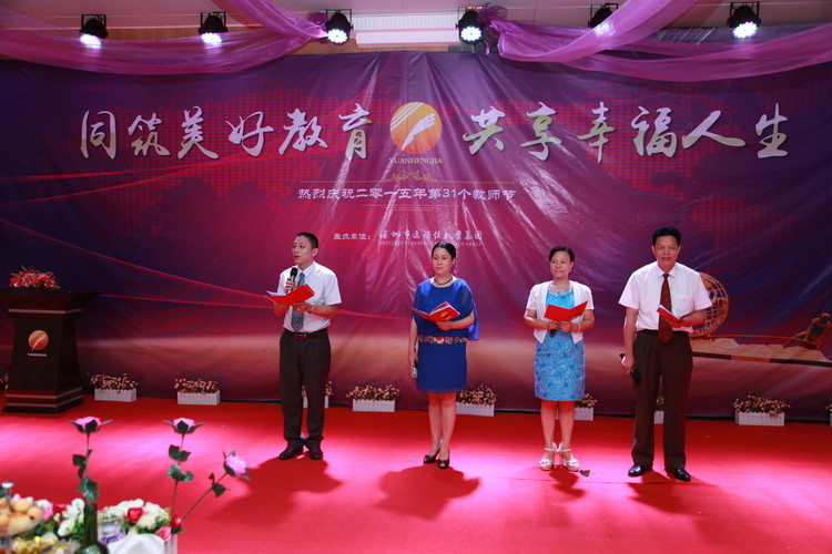 2015年9月9日晚,深圳市遠(yuǎn)恒佳教育集團(tuán)隆重舉行主題為“共筑美好教育,共享幸福人生”的慶祝第31個(gè)教師節(jié)、中秋節(jié)活動(dòng)。集團(tuán)3所學(xué)校、13所幼兒園、國(guó)際教育城、公明少年宮等單位近300多名中高層管理人員歡聚一堂,共同慶祝這個(gè)屬于自己的節(jié)日。深圳前海匯豐達(dá)資產(chǎn)管理公司投資總監(jiān)盧學(xué)鵬、深圳市云企電商信息技術(shù)有限公司董事長(zhǎng)毛清平、深圳前海牛牛財(cái)富互聯(lián)網(wǎng)金融公司總監(jiān)張廣輝、廣州銀行龍華支行行長(zhǎng)、金融平臺(tái)公司風(fēng)控總監(jiān)劉銳、深圳市云企眾籌平臺(tái)公司總經(jīng)理李剛、中國(guó)安芯(上市公司)執(zhí)行總裁、云企公司董事沈睿等嘉賓蒞臨活動(dòng)現(xiàn)場(chǎng),與大家一起歡慶第31個(gè)教師節(jié)。慶祝活動(dòng)在一片喜慶祥和的氛圍中拉開(kāi)了序幕,董事會(huì)領(lǐng)導(dǎo)向與會(huì)人員贈(zèng)送賀卡與鮮花,進(jìn)行有趣的音樂(lè)互動(dòng)游戲。