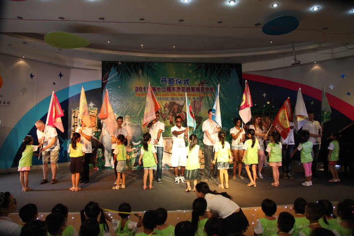 別具一格的開營儀式,拉開了本次夏令營活動的序幕,遠(yuǎn)恒佳教育集團(tuán)董事長宋遠(yuǎn)標(biāo)、副董事長麥麗芬出席開營儀式。孩子們的手語表演《相伴同行》、《有你真好》、《一路有愛》充分展示了校園文化;Keven、Diana、Dima等10名外教教官帶來的叢林拍手舞、亞馬遜叢林部落舞蹈表演歡快激情,客串的印第安繪畫秀、瘋狂科學(xué)家、流淌的音符、亞馬遜叢林部落居民生活秀引人入勝,Keven等外教的憨豆先生表演秀幽默風(fēng)趣,引來孩子們歡樂的笑聲;在經(jīng)曲舞蹈《營旗飄飄》后,各班代表接受營旗,凸顯了團(tuán)隊(duì)精神的打造。