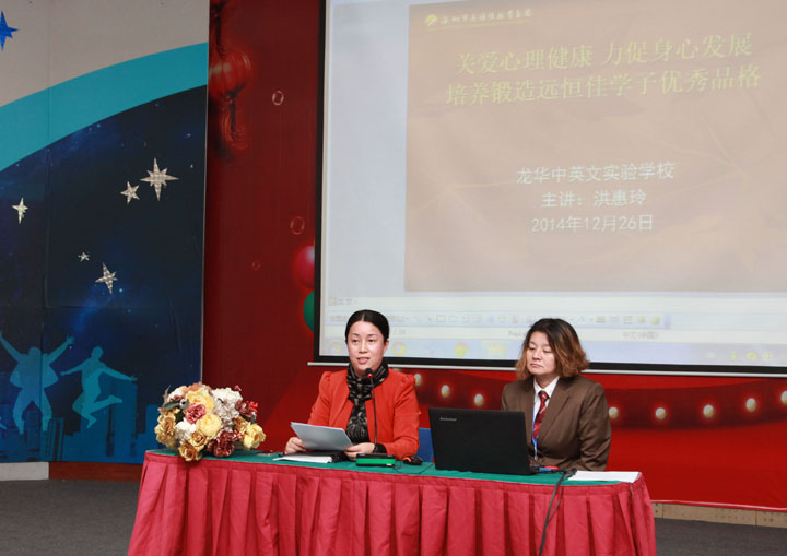 2014年12月26日下午,龍華中英文實(shí)驗(yàn)學(xué)校舉辦“關(guān)愛(ài)心理健康,力促身心發(fā)展,培養(yǎng)鍛造遠(yuǎn)恒佳學(xué)子優(yōu)秀品格”心理健康專題講座,由董事助理、辦公室主任程琳娜主持,加拿大歸國(guó)心理學(xué)教授洪惠玲作專題講座。專題講座后,組織全體教師共同學(xué)習(xí)《生命宣言書(shū)》。